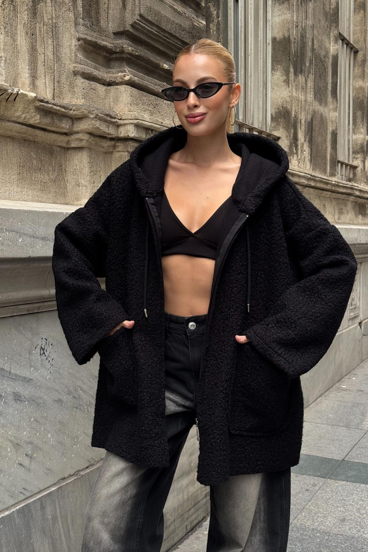 Buklet Ceket Kapşonlu Kaban Çift Cepli Salaş Model Oversize SIYAH (CD-6081.SİYAH.STANDART-8880)