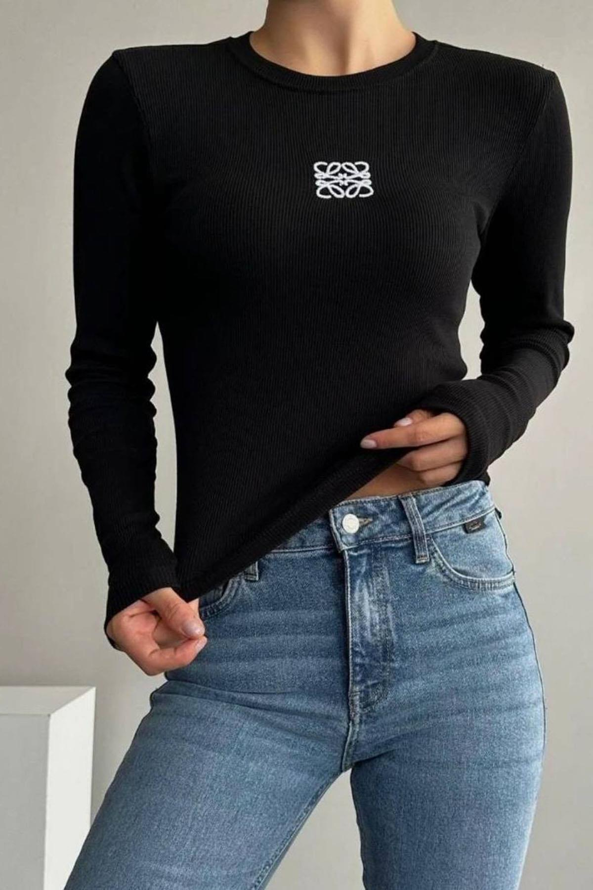 Kadın Bisiklet Yaka Logo Nakış İşleme Detaylı Pamuklu Kaşkorse Kumaş Bady Bluz SIYAH (CD-7308.SİYAH.S-8555)