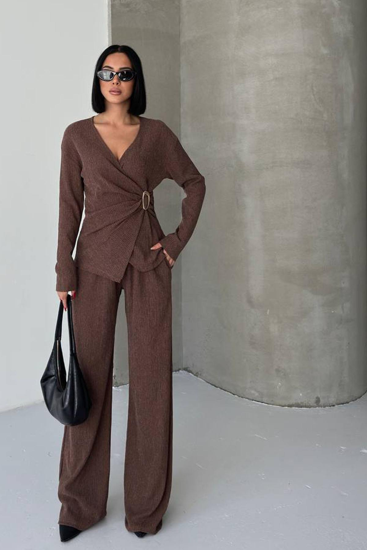 Kadın Bürümcük Kumaş Tokalı Kruvaze Pantolon Takım (CD-1314.KAHVERENGİ.S-8858)