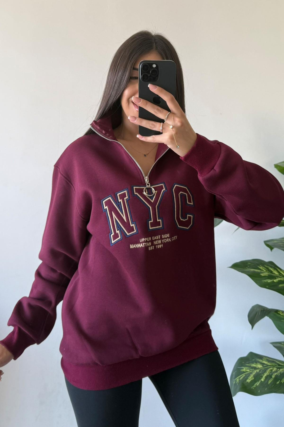 Kadın Dik Yaka Yarım Fermuarlı Baskılı Üç İplik Şardonlu Sweat Rahat Kalıp Uzunluk 70cm BORDO (CD-6801.BORDO.S-8904)