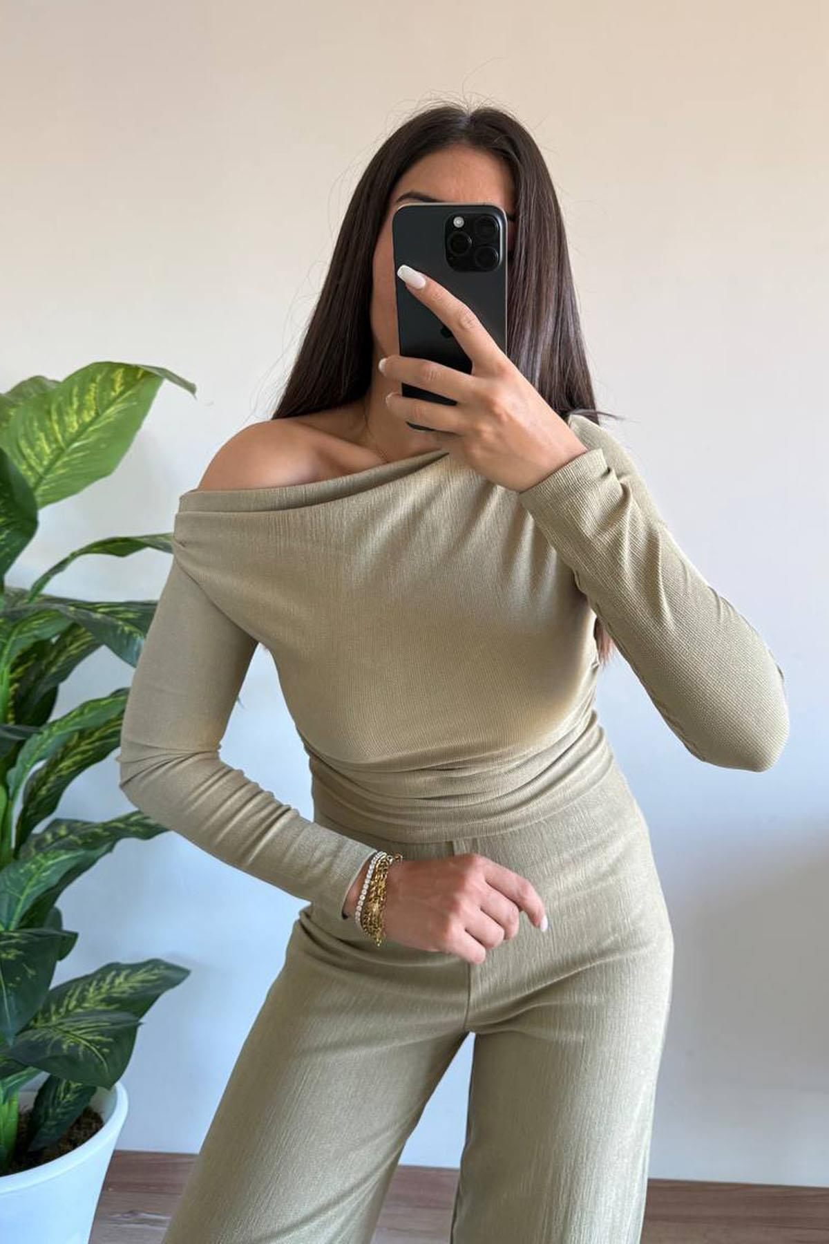 Kadın Drape Detay Kayık Yaka Bürümcük Takım/YESIL/S