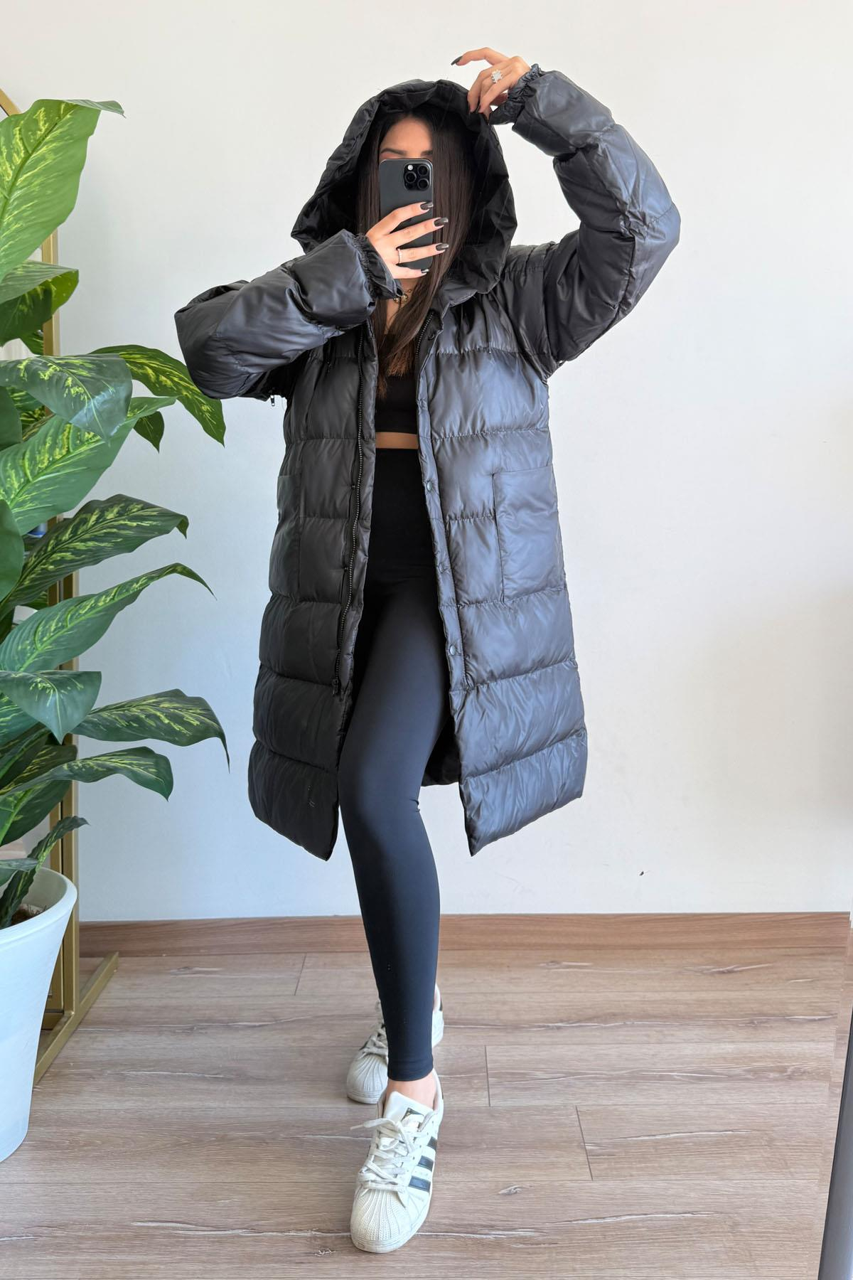 Kadın Kapşonlu 95cm Uzun Şişme Mont Fermuarlı Çıt Çıt Kapamalı Çı