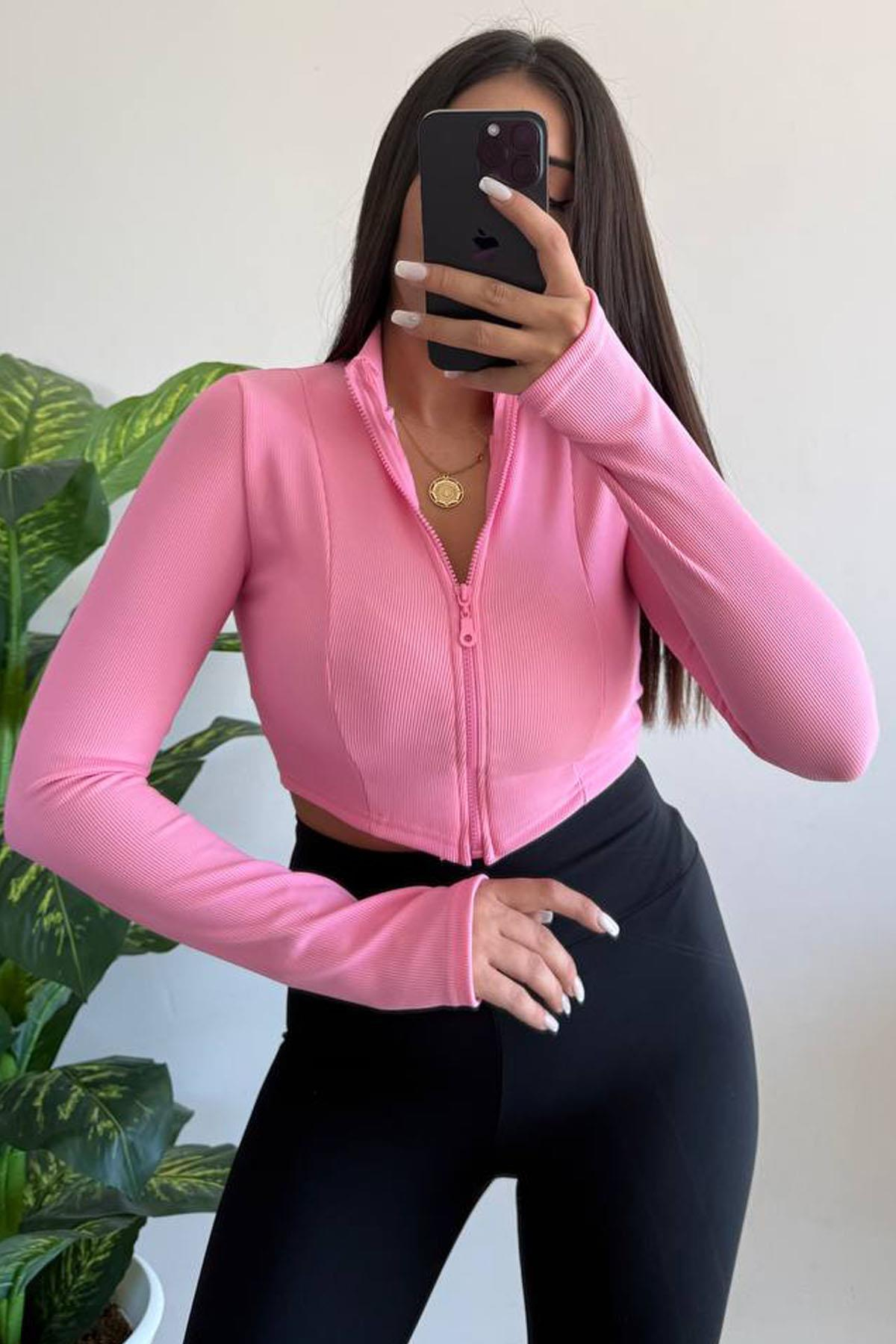 Cidde Kadın Ottoman Kumaş Fermuarlı Parmak Geçme Deta Crop Bady Ceket PEMBE