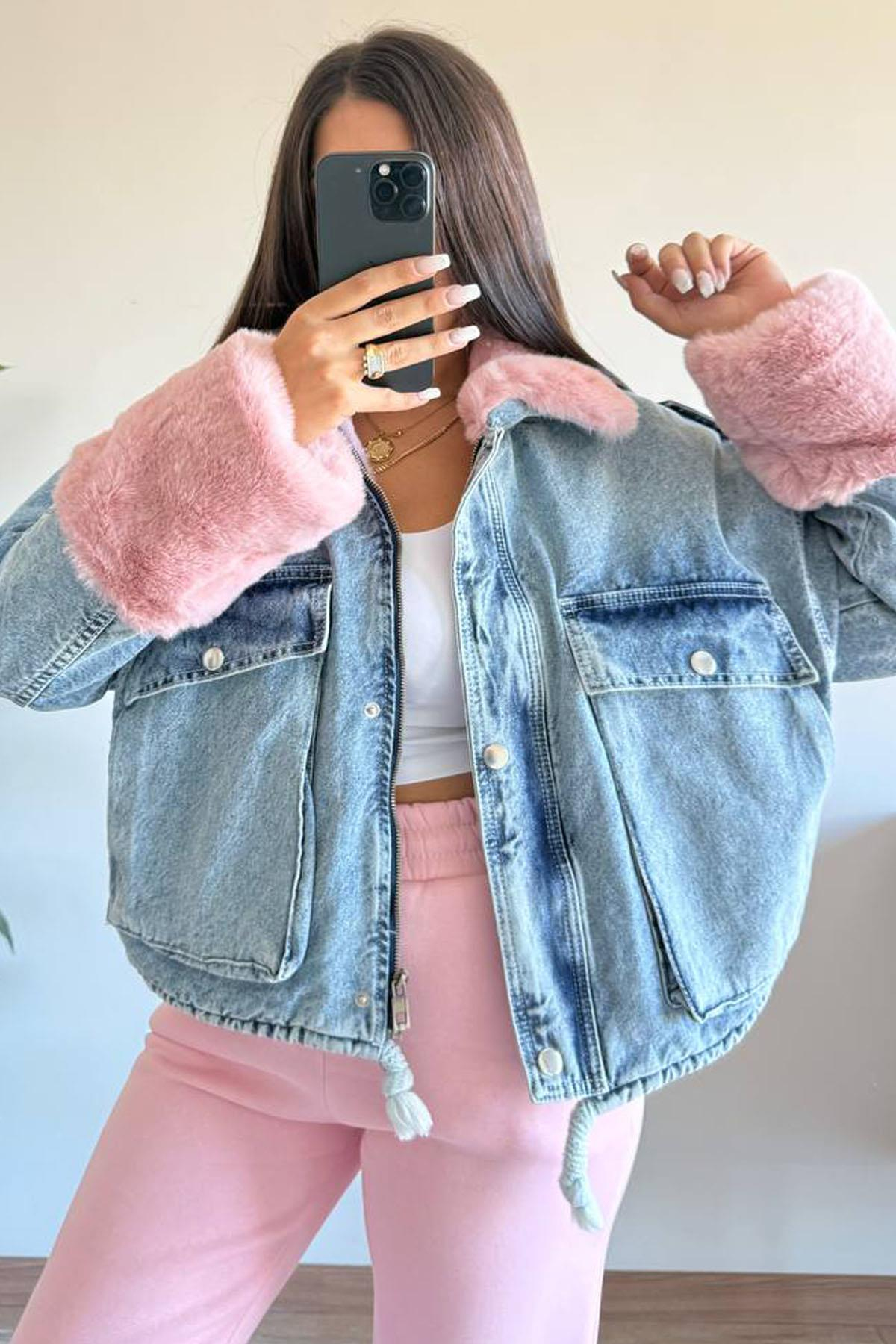 Kadın Pembe Kürklü Denim Ceket Mont (CD-0716.PEMBE.STANDART-8772)