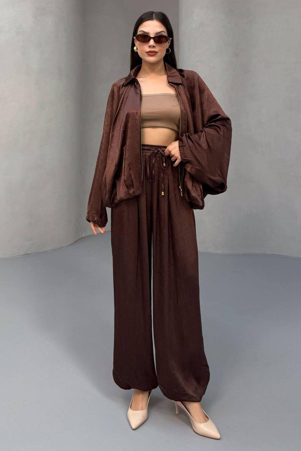 Kadın Saten Bomber Ceket Şalvar Pantolon Takım KAHVERENGI (CD-14024.KAHVERENGİ.S-8888)