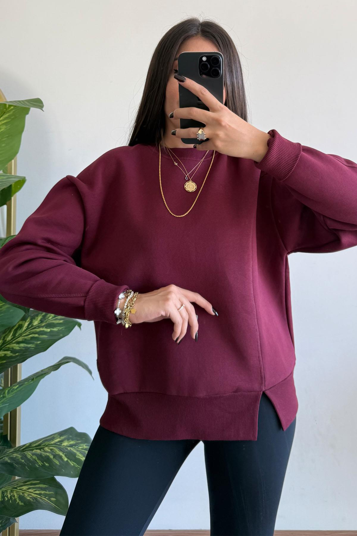 Cidde Kadın Üç İplikŞardonlu Basic Bisiklet Yaka Sweatshirt BORDO