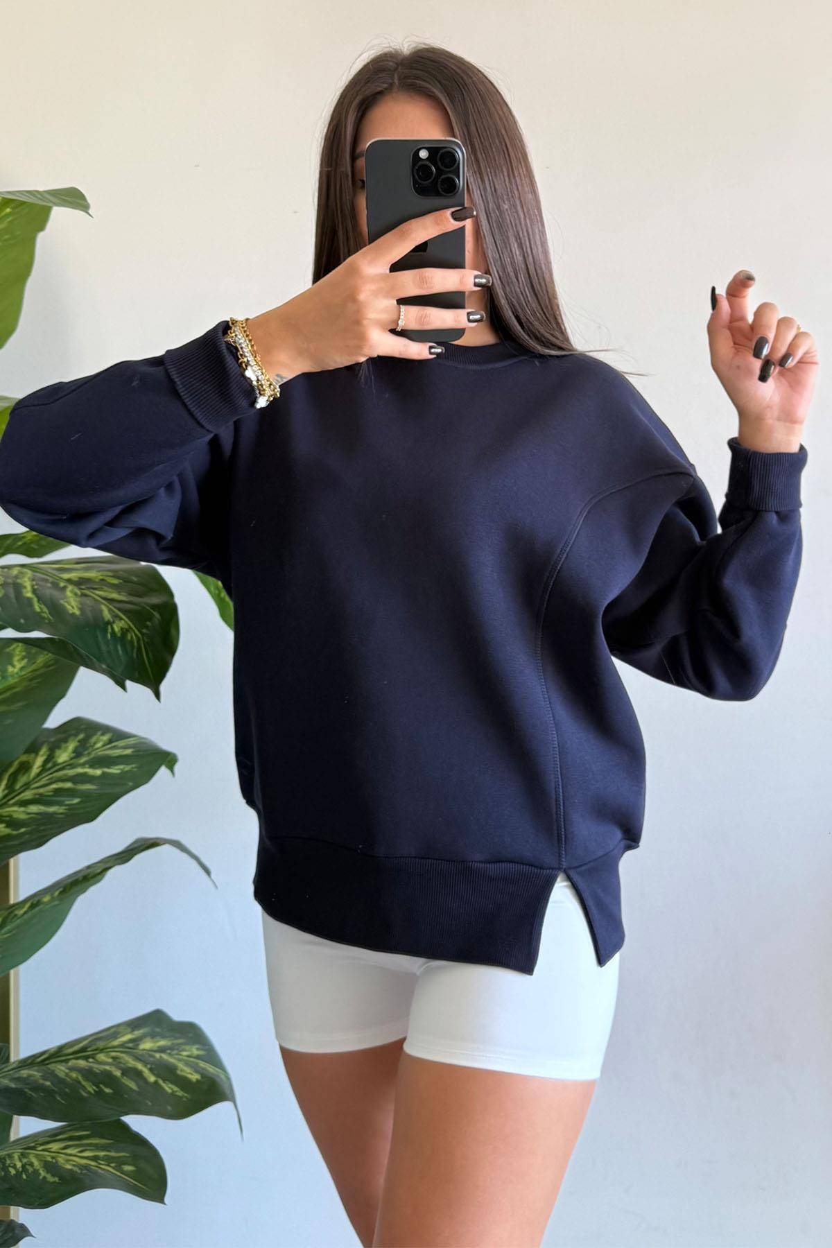 Cidde Kadın Üç İplikŞardonlu Basic Bisiklet Yaka Sweatshirt LACIVERT
