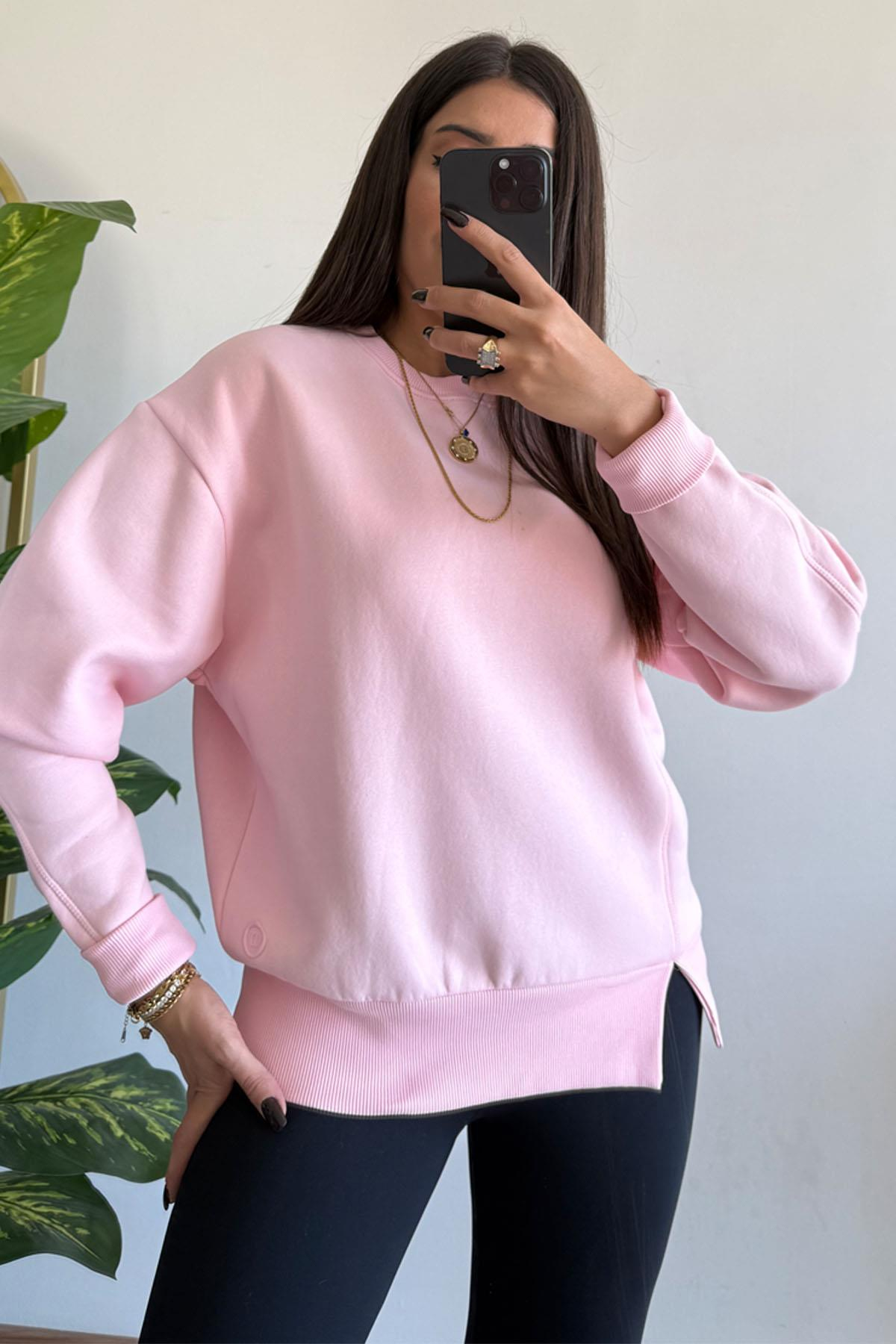 Cidde Kadın Üç İplikŞardonlu Basic Bisiklet Yaka Sweatshirt PEMBE