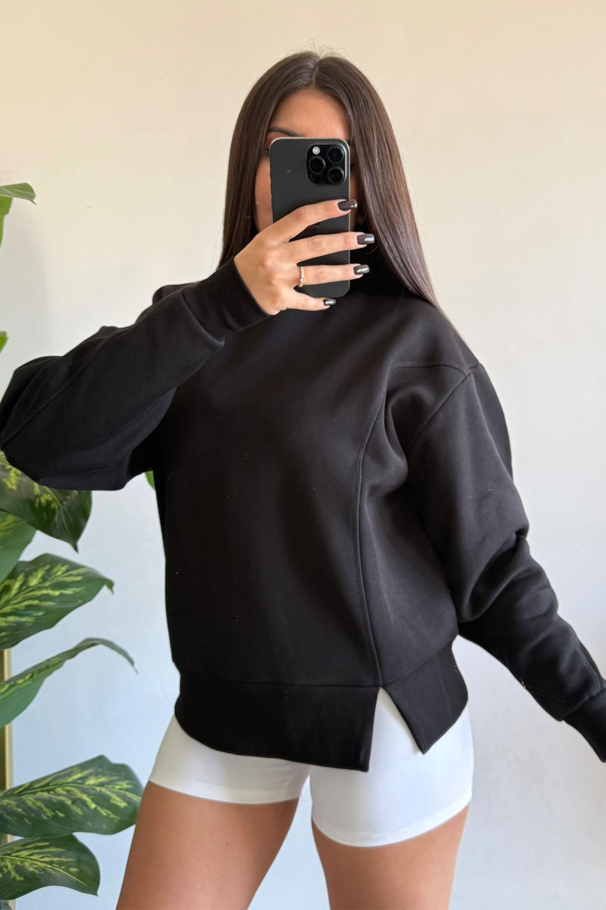 Cidde Kadın Üç İplikŞardonlu Basic Bisiklet Yaka Sweatshirt SIYAH