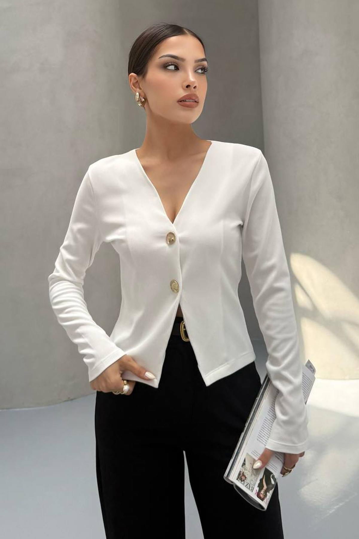 Cidde Kadın V Yaka Düğmeli Hırka Bluz BEYAZ