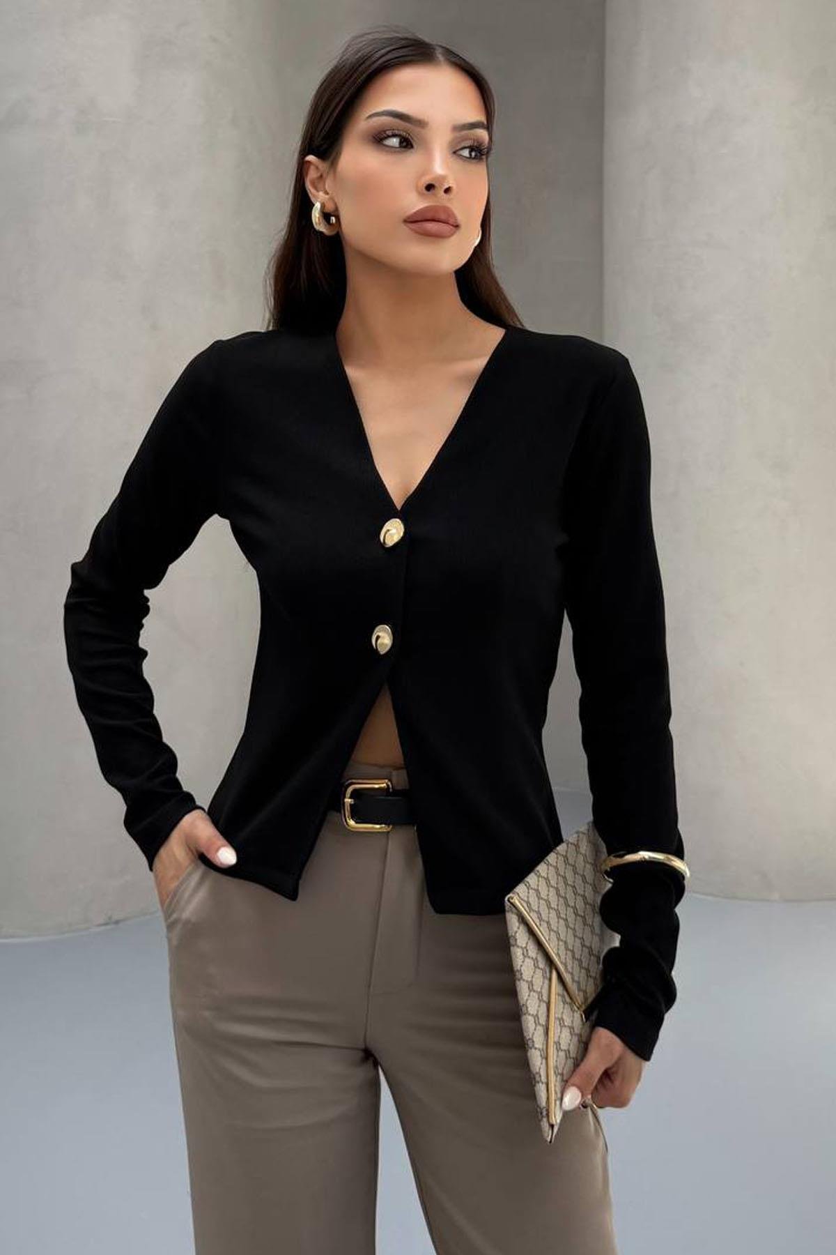 Kadın V Yaka Düğmeli Hırka Bluz SIYAH (CD-13993.SİYAH.S-8759)