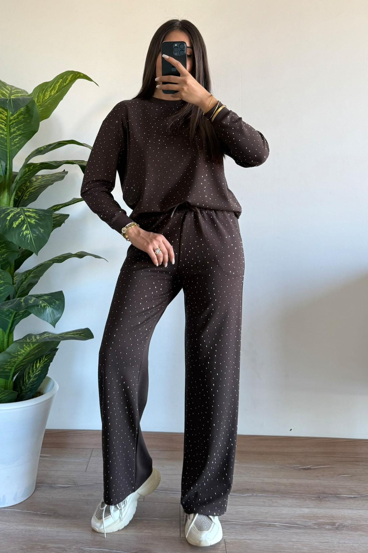 Kadın Vip Kalite Ful Taşlı Modal kumaş Eşofman Takımı /KAHVERENGI