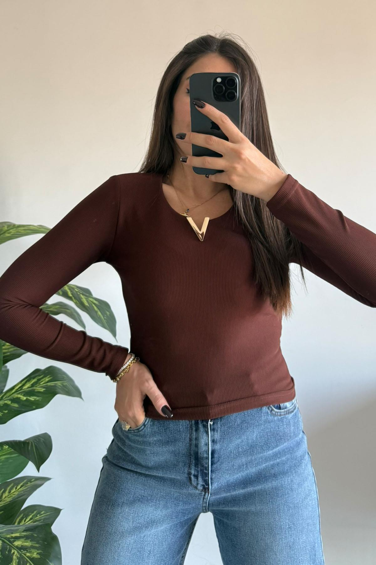 Kaın Yaka Metal Ottoman Kumaş Body Bluz KAHVERENGI (CD-2278.KAHVERENGİ.S-8675)