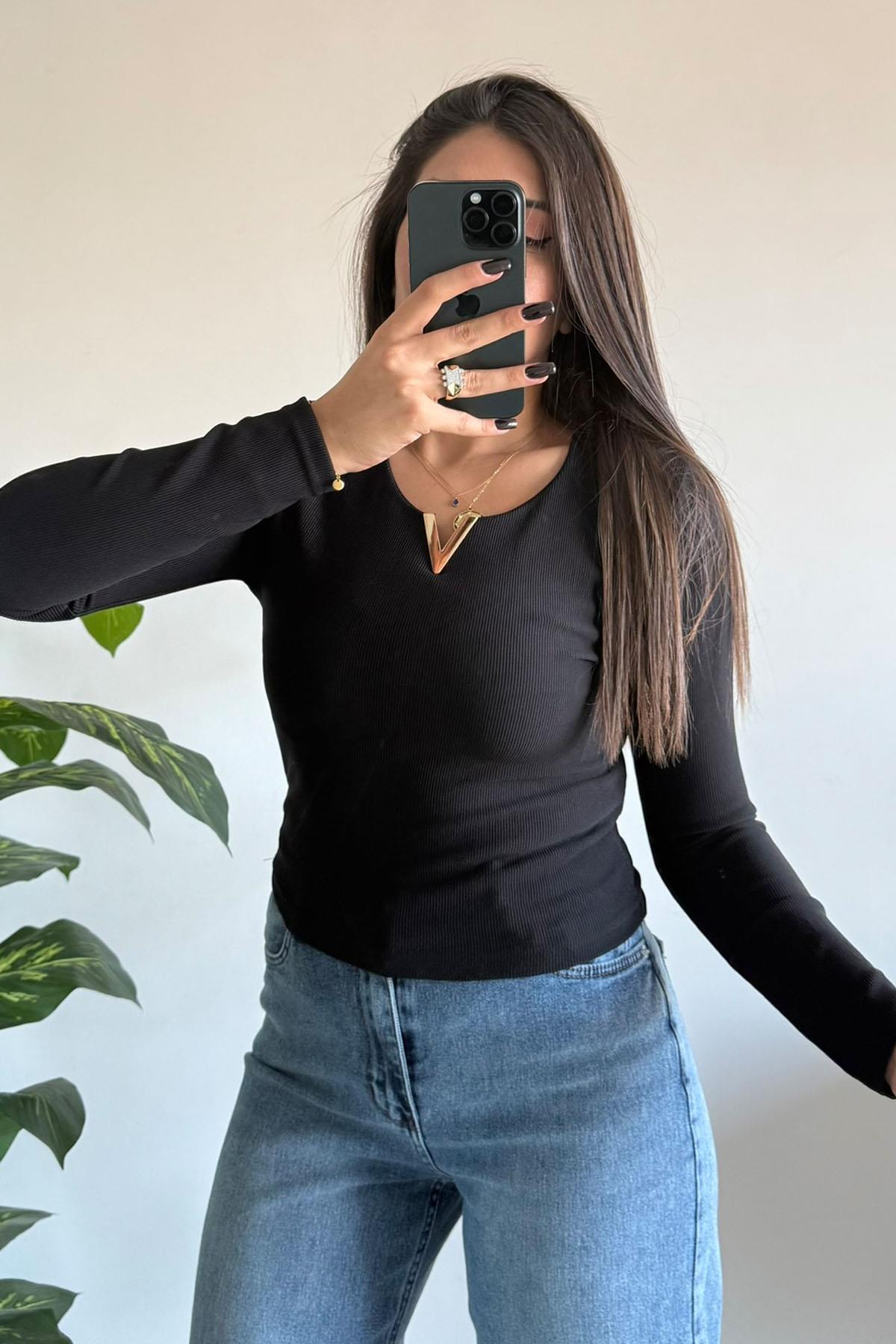 Kaın Yaka Metal Ottoman Kumaş Body Bluz SIYAH (CD-2278.SİYAH.S-8669)