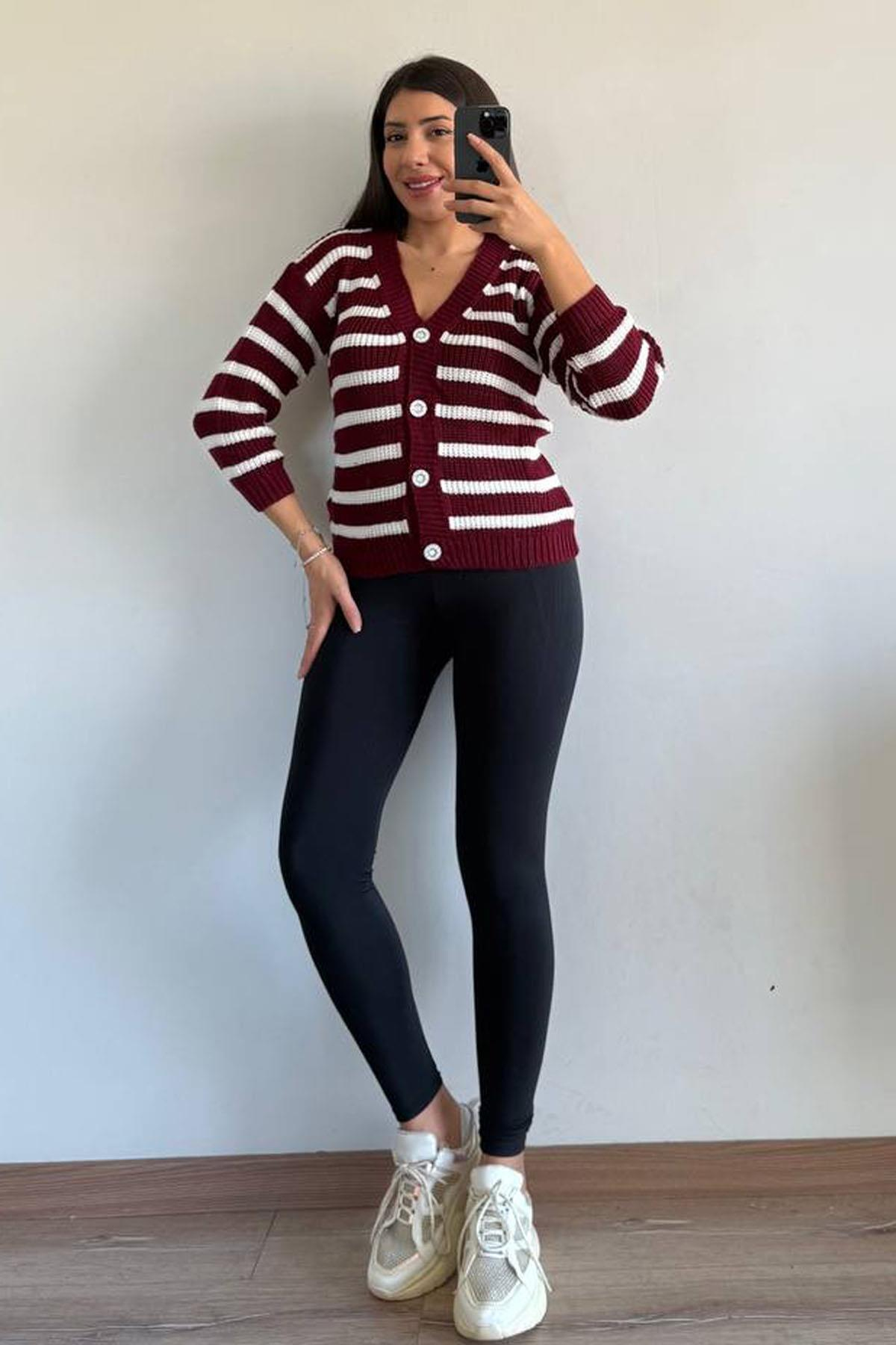 Kadın Çizgili Örme Hırka Ceket/BORDO/STANDART