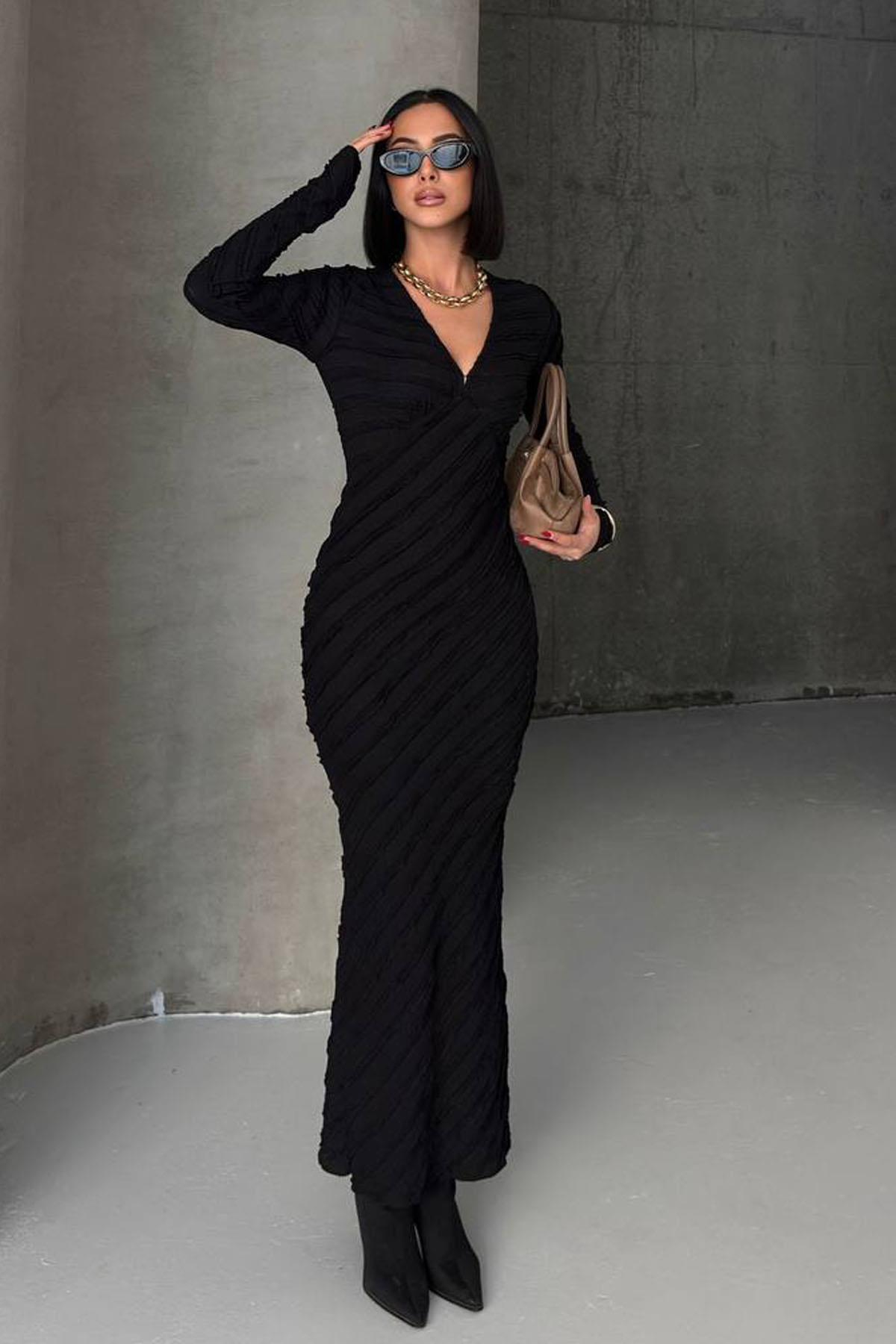 Kadın V Yaka Fırfırlı Elbise SIYAH (CD-1225.SİYAH.S-8616)